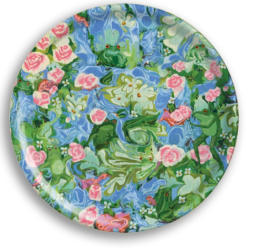 Spark a conversation at your next gathering with this large round tray from Avenida Home. Handcrafted in Sweden from sustainably sourced birchwood, it features mischievous frogs camouflaged amongst lily pads and pondweed. The vibrant blue, green and pink colorway brings a fresh and contemporary feel to any occasion. At 18″ in diameter, with a broad rim and spill-resistant laminated finish, this wooden frog tray is ideal for serving drinks at a party. New York based artist Danielle Kroll is known for her fun and playful illustrations, which draw upon her passion for the natural world.