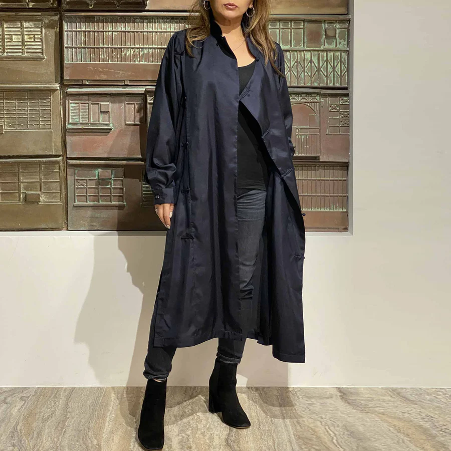 Featuring a classic mandarin collar and knot buttons, this jacket retains traditional elements while incorporating modern design elements. Its long, flowing silhouette is flattering and comfortable, and the lightweight silk fabric is perfect for any season, making it a great statement piece for any occasion.