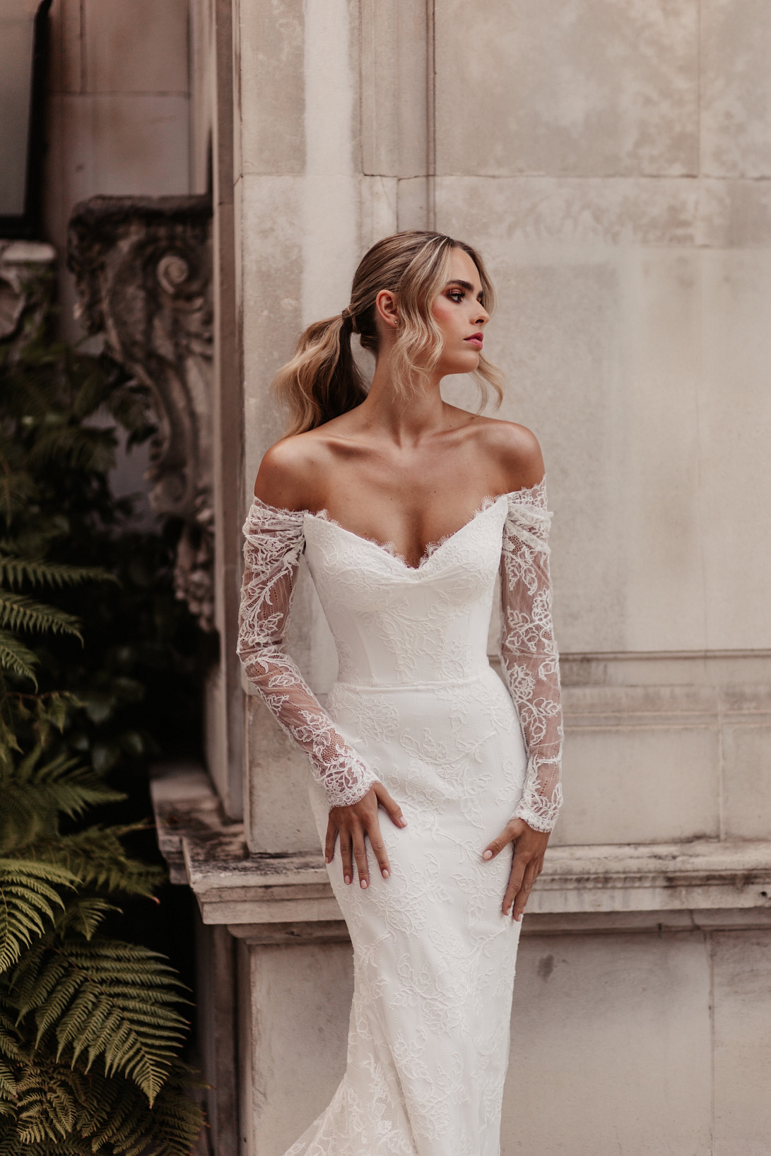 The “Stravinsky” dress from Suzanne Neville’s Symphony Collection 2024 is a fitted lace gown with a modern sweetheart neckline and detachable long lace sleeves. It features a corseted bodice and covered buttons along the back, blending classic elegance with contemporary style.